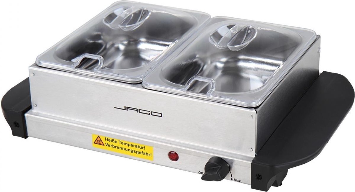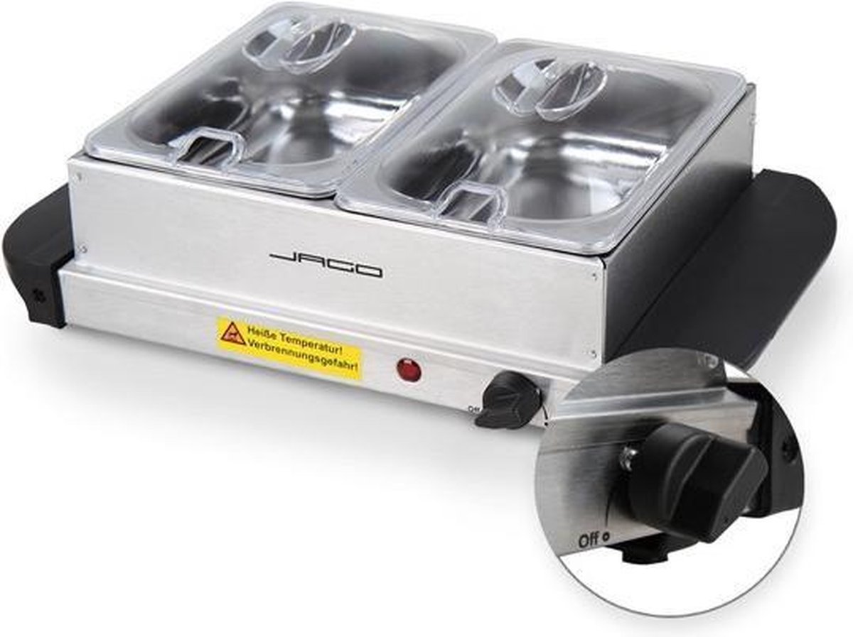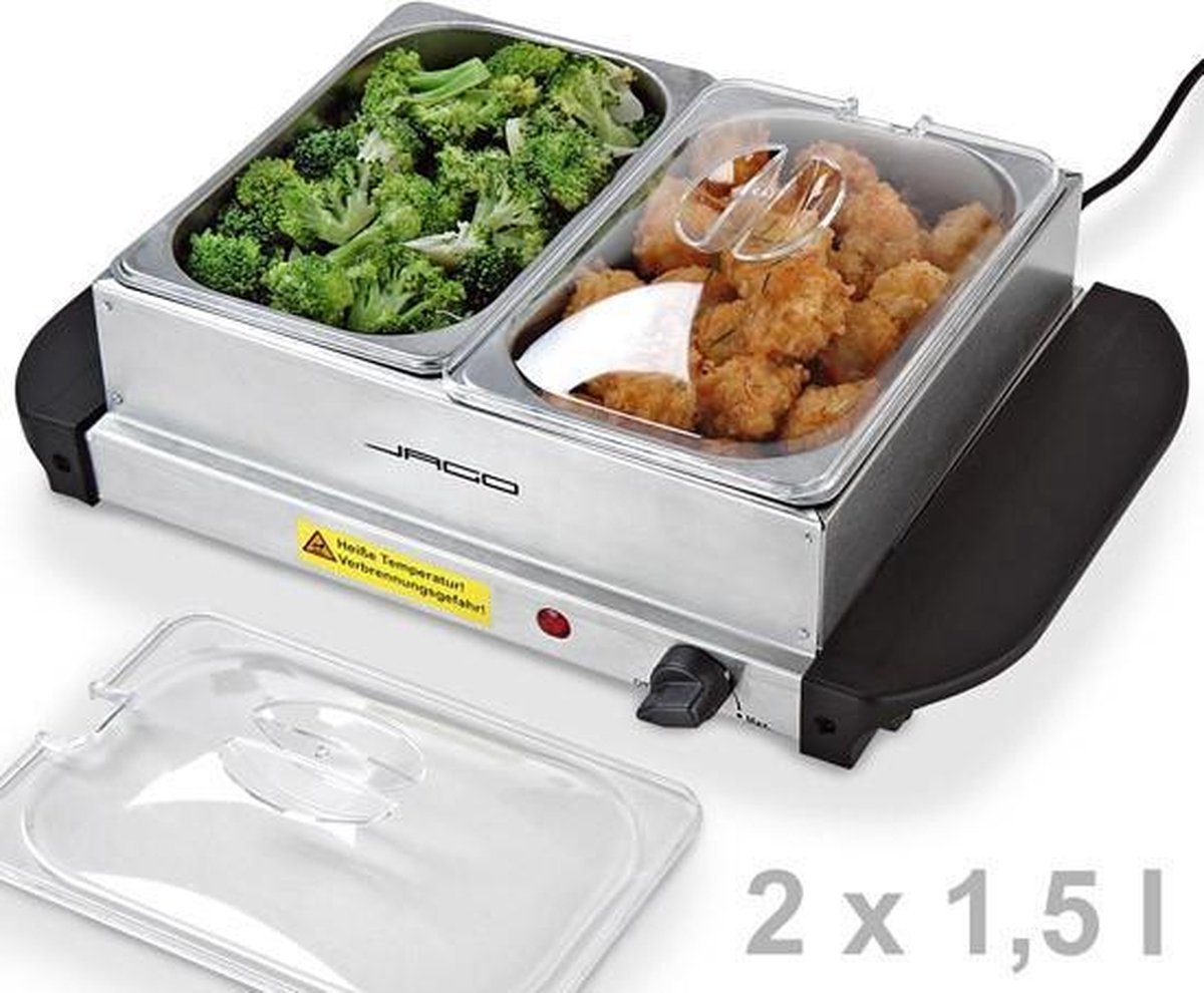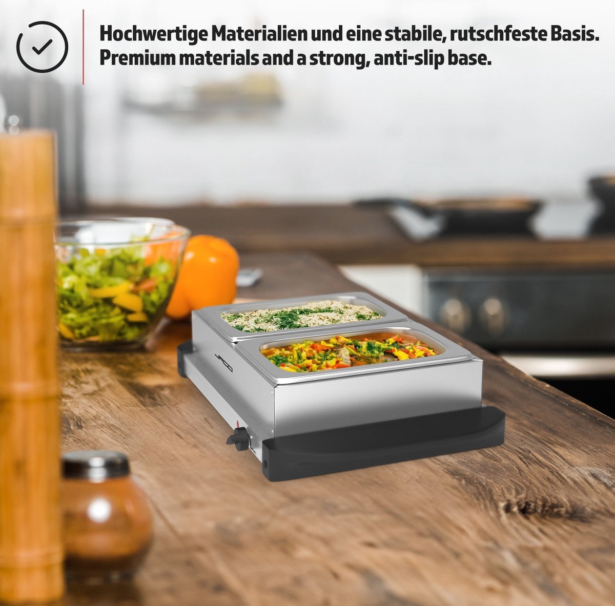 يتميز الجهاز بهيكل متين من الفولاذ المقاوم للصدأ مع قدرة كهربائية 150 واط، ويوفر تحكمًا كاملًا في درجة الحرارة بفضل منظم الحرارة القابل للتعديل من 45 إلى 85 درجة مئوية، مما يسمح لك بالحفاظ على حرارة الطعام حسب نوعه.
