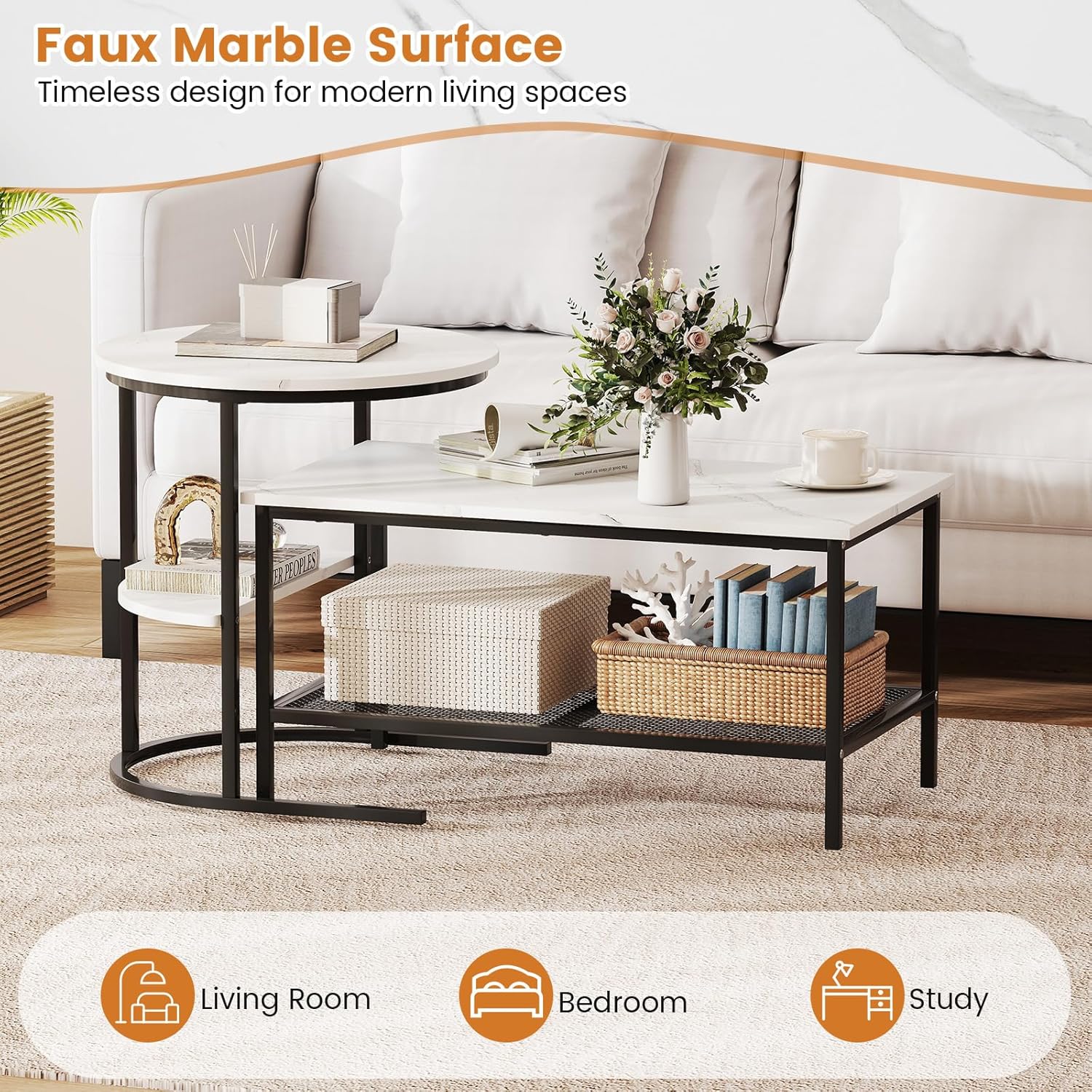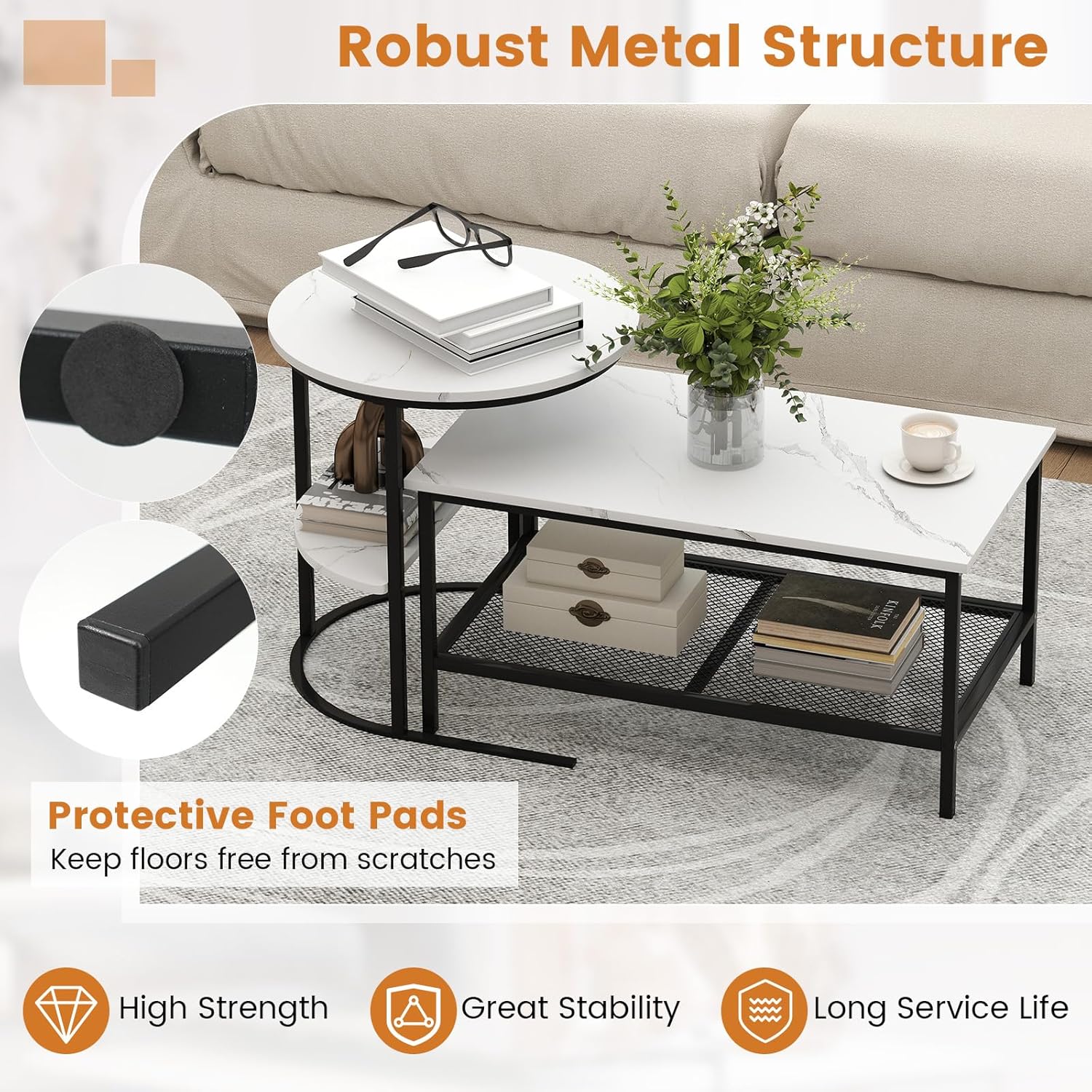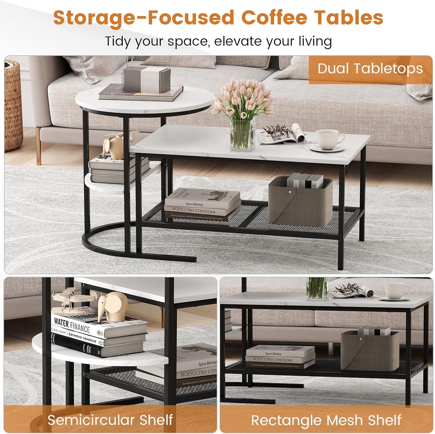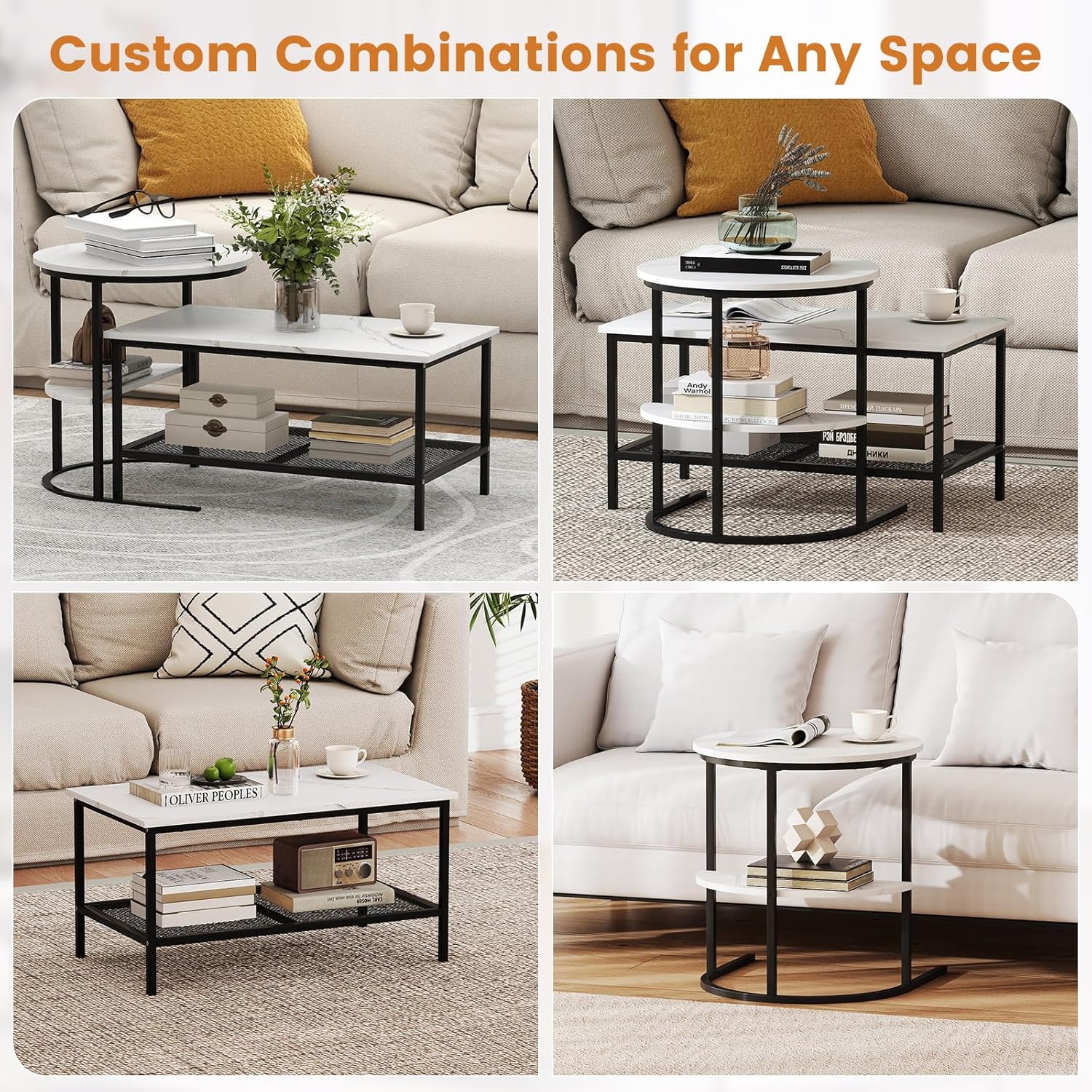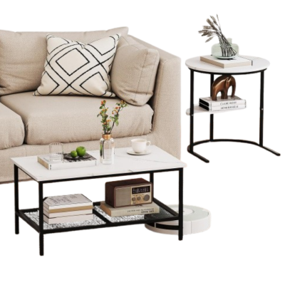 تصميم 2 في 1 قابل للفصل: طاولة مستطيلة كبيرة وطاولة جانبية دائرية صغيرة، يمكن وضع الطاولة الصغيرة تحت الأريكة لتوفير المساحة.
