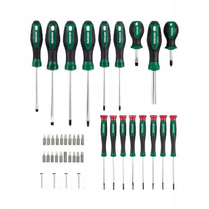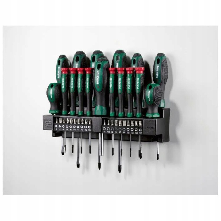 مجموعة PARKSIDE العملية تحتوي على 37 قطعة، وتشمل مفكات مختلفة وبِتات متنوعة، مع حامل جداري لتخزين منظم وواضح. تصميم المقبض مريح وعملي لتسهيل العمل لفترات طويلة، وجميع المفكات مزودة بنهاية مغناطيسية لتثبيت البراغي بسهولة.