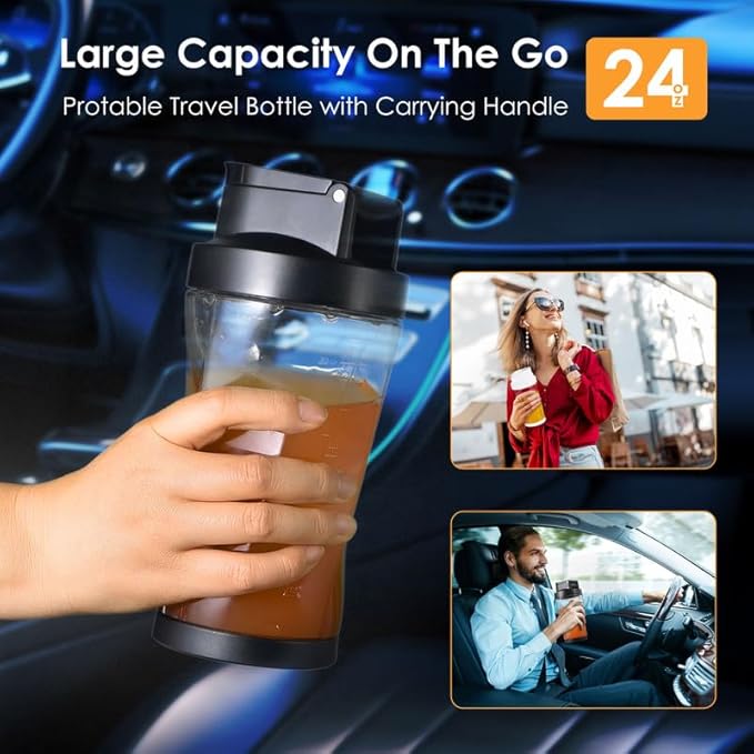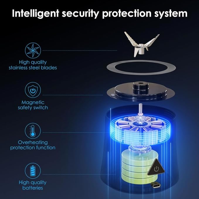 • آمن وصحي: مصنوع من مادة Tritan خالية من BPA، مع نظام أمان مغناطيسي ذكي يمنع التشغيل في حال عدم الإغلاق الصحيح.