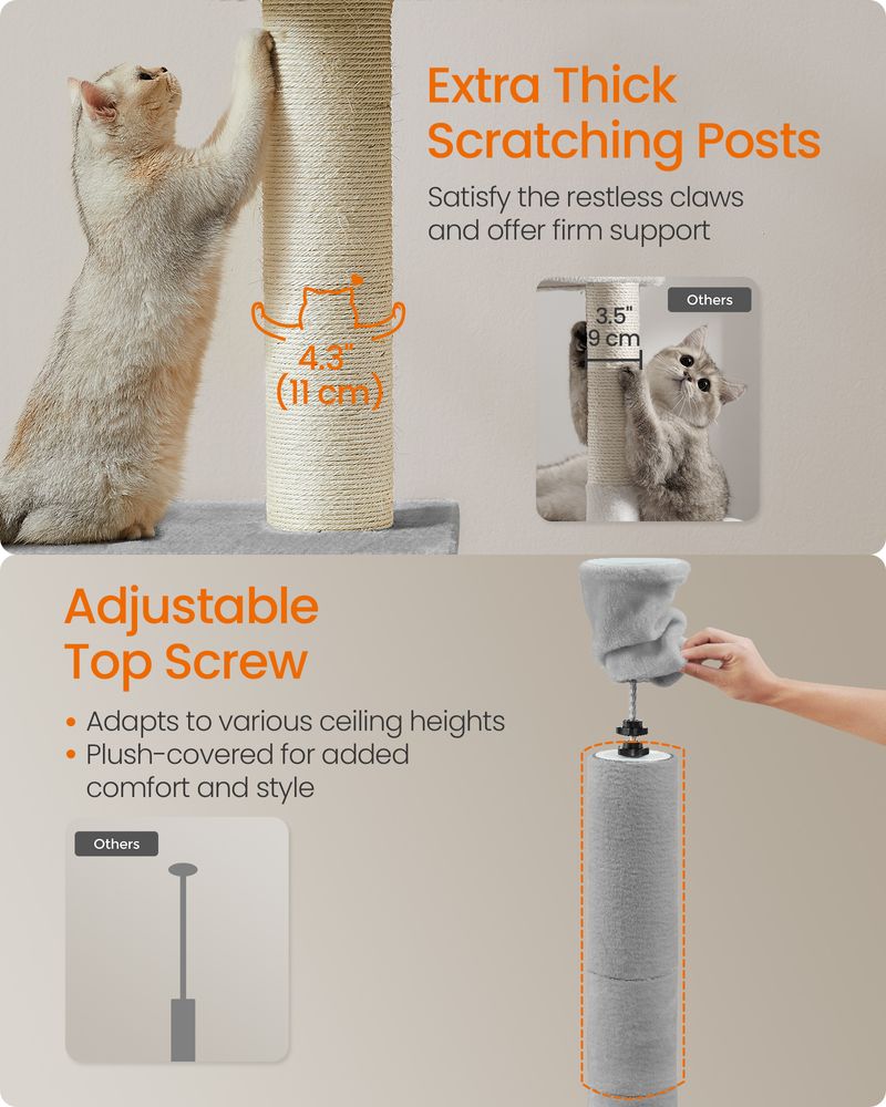 ارتفاعات قابلة للتعديل: يمكن تعديل ارتفاع الشجرة بسهولة من 231 سم إلى 291 سم لتناسب سقف منزلك واحتياجات قطتك.