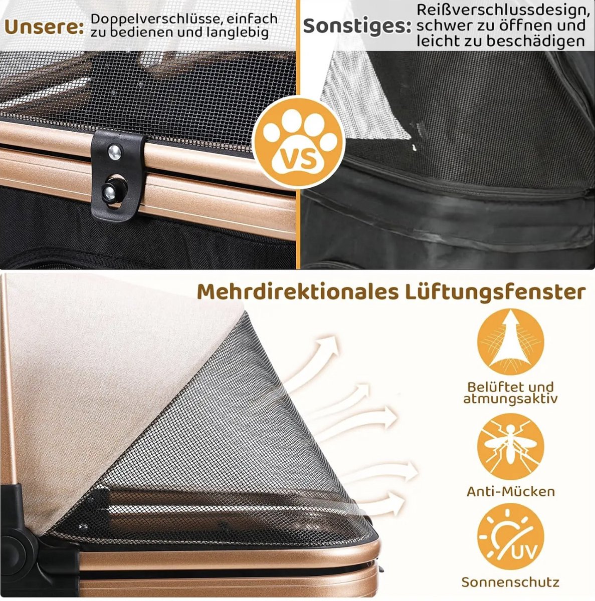 توفر العربة تهوية ممتازة ومساحة مريحة لحيوانك الأليف، مع حزام أمان داخلي لضمان الثبات أثناء الحركة. كما تأتي مع مساحة تخزين واسعة في الأسفل وجيوب جانبية وحامل أكواب، لتبقى جميع مستلزماتك في متناول اليد.