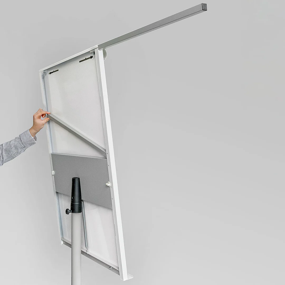 تتميز اللوحة بسطح مغناطيسي أبيض من الفولاذ المطلي، قابل لتعديل الارتفاع بنظام زنبركي عملي ليتناسب مع مختلف المستخدمين. كما تحتوي على حامل أوراق قابل للتعديل مع خطافات لتعليق الملاحظات بسهولة، بالإضافة إلى ذراعين تلسكوبيين خلفيين لعرض الأوراق المهمة وإبقائها مرئية لجميع المشاركين.