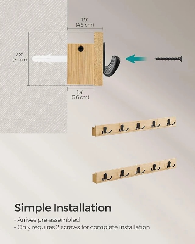 تصل الشماعات مجمعة مسبقًا، ويمكن تثبيتها بسهولة على الحائط باستخدام مسمارين فقط.