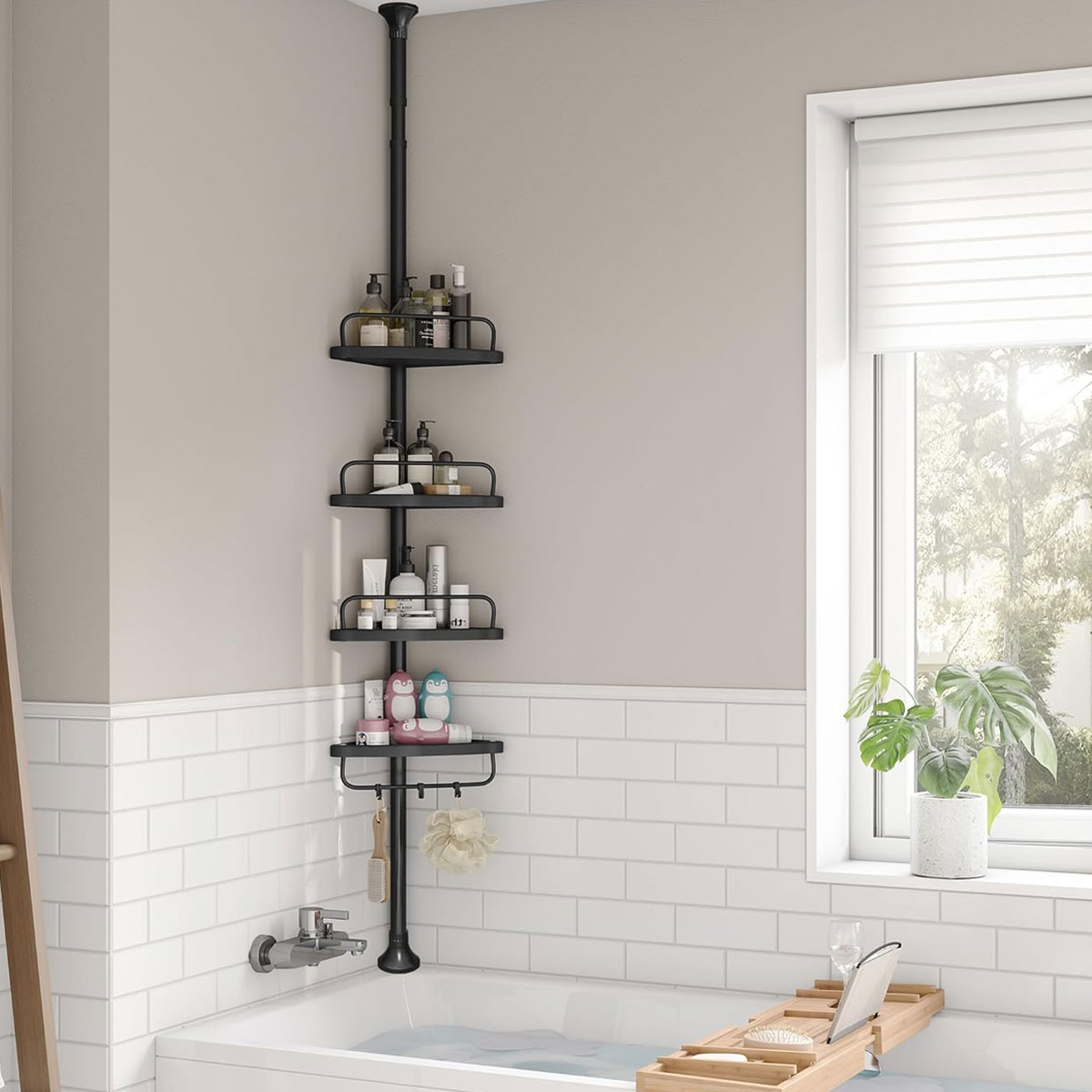 منظم حمام عمودي قابل للتعديل من SONGMICS مع 4 رفوف و3 خطافات – ارتفاع 85 إلى 305 سم – أسود (BCB001B01)