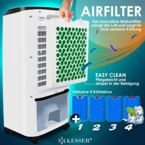 Very low energy consumption: A major advantage of the KESSER air cooler compared to conventional air conditioners is its superior energy efficiency, regardless of the energy class of the air conditioner. With a power consumption of only 65W, the device provides noticeable and continuous cooling for small to medium-sized rooms.