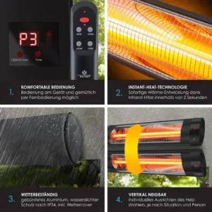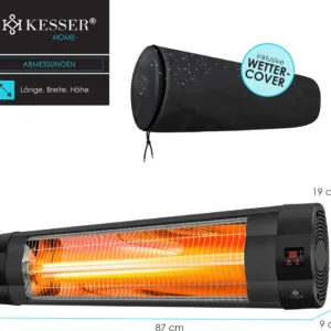 Protection and safety: thanks to the quick and easy installation, the high-quality heater can be quickly attached to the wall – so the device is no danger to children or pets. The heater guarantees waterproof protection against rain, because it is corrosion-resistant, splash-proof and gets additional protection thanks to the included weather cover.