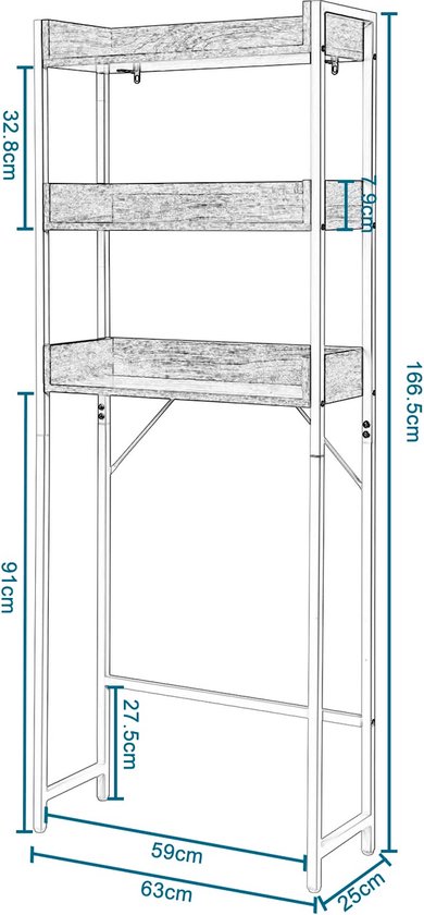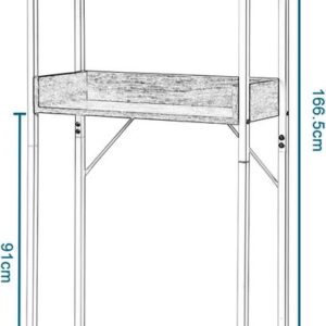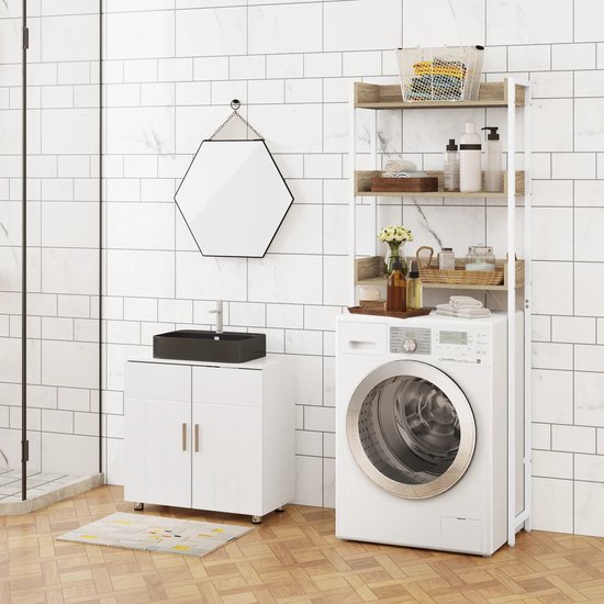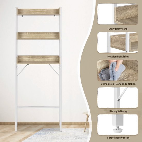 يجمع التصميم العصري بين الإطار المعدني الأبيض والرفوف بلون خشب البلوط الفاتح ليضفي لمسة أنيقة ومنعشة على أي مكان، سواء في الحمام أو غرفة الغسيل أو حتى الشرفة. كما تم تزويد الخزانة بأنظمة مانعة للانقلاب وأقدام قابلة للتعديل لضمان الثبات والأمان حتى على الأرضيات غير المستوية.