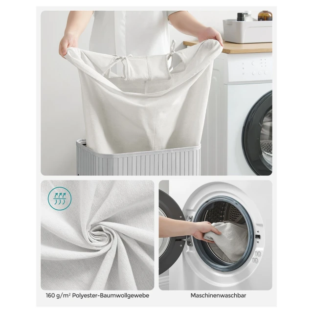 توفر شرائح الخيزران المتينة ثباتًا عاليًا وقدرة تحمل تصل إلى 20 كجم، كما يمكن طي السلة عند عدم الاستخدام لتوفير المساحة. تحتوي على كيس داخلي قابل للإزالة مصنوع من قماش قطني عالي الجودة، ويمكن غسله في الغسالة لسهولة التنظيف. بالإضافة إلى ذلك، تتيح المقابض القطنية الجانبية نقل السلة بسهولة، مع تركيب سريع وبسيط بفضل التعليمات الواضحة.