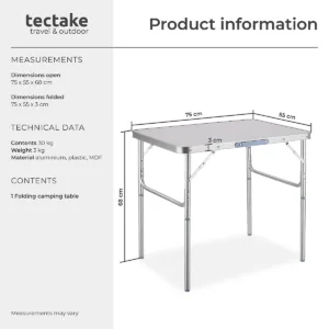 استمتع بالراحة في جميع مغامراتك الخارجية مع طاولة التخييم القابلة للطي من tectake، المصممة لتكون خفيفة الوزن، عملية وسهلة النقل. مثالية للاستخدام في المخيمات، الحدائق، النزهات أو حتى الشرفات.