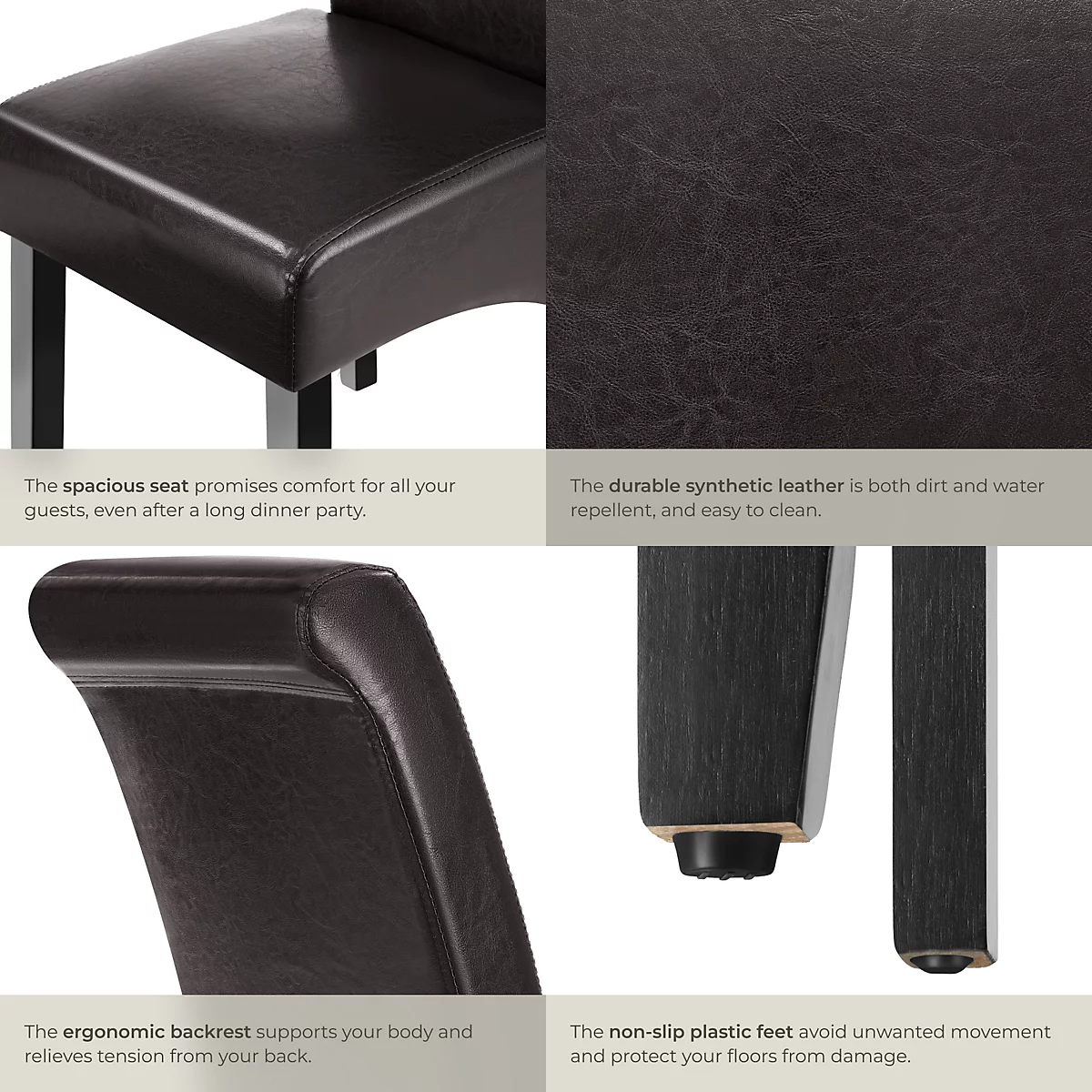 المقاعد مبطنة بحشوة مريحة ومغطاة بجلد صناعي عالي الجودة سهل التنظيف، مما يجعلها عملية للاستخدام اليومي. الأرجل مصنوعة من خشب صلب بلمسة نهائية لامعة، مما يضمن ثباتاً ممتازاً ومتانة تدوم لسنوات.