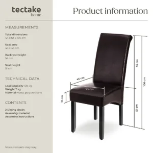 أضف لمسة دافئة وأنيقة إلى غرفة الطعام مع طقم كرسيي الطعام من tectake باللون البني الكلاسيكي. يتميز الكرسيان بتصميم هندسي مريح يدعم الجلوس لفترات طويلة، مع مسند ظهر مرتفع يمنح دعماً مثالياً للظهر والعمود الفقري.