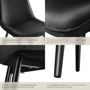 يتميز الكرسي بمقعد مريح بتصميم هندسي (Ergonomic) مع مسند ظهر واسع يدعم الجلوس لفترات طويلة. التنجيد المخملي الناعم يمنح إحساساً فاخراً، بينما توفر الأرجل الفولاذية السوداء المتينة ثباتاً عالياً وتحمل الاستخدام اليومي.