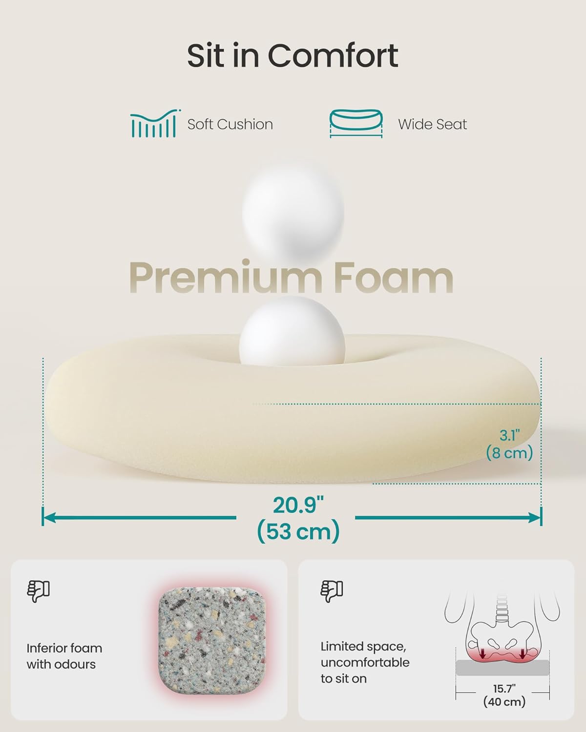 تم تجهيز المقعد بإسفنج عالي الجودة بسمك 8 سم مع وسادة جلوس واسعة بطول 53 سم لتخفيف الضغط على الوركين طوال اليوم. ويسمح القماش الشبكي القابل للتهوية بمرور الهواء للحفاظ على برودة الجسم حتى مع الجلوس الطويل.