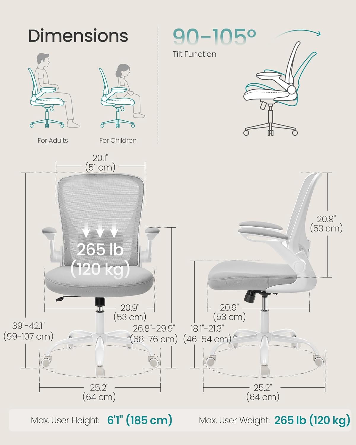 يوفر الكرسي مرونة عالية وملاءمة لمختلف الاحتياجات، حيث يمكن تعديل ارتفاع المقعد من 46 إلى 54 سم، مع إمكانية إمالة الظهر من 90° إلى 105° للاسترخاء. كما يمكن طي مساند الذراعين للأعلى لتخزين الكرسي بسهولة أسفل المكتب وتوفير المساحة.
