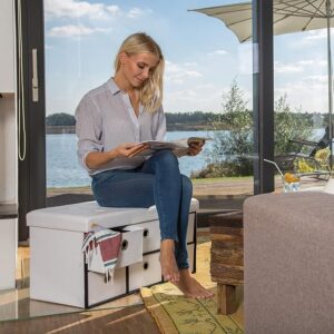صندوق التخزين مزود بـ 6 أقسام قابلة للإزالة لتخزين الألعاب، المجلات، الكتالوجات، البطانيات، الكابلات، والأغراض الصغيرة الأخرى، مما يساعد على ترتيب المساحات بشكل أنيق ومرتب. كما يمكن طي المقعد بسهولة لتوفير مساحة إضافية عند الحاجة.