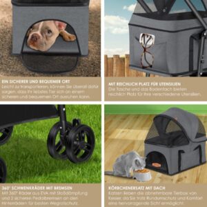 HIGH QUALITY AND ROBUST: Enjoy wonderful moments with your four-legged friend in the fresh air and benefit from a comfortable ride thanks to the robust 360° wheels. The full rubber tires made of EVA are also suitable for particularly demanding routes. In addition, you can take plenty of treats, toys, food and much more with you in the spacious basket. The breathable mesh fabric ensures excellent ventilation in the interior.