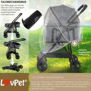 SAFETY: If clouds unexpectedly appear during a walk, you are well prepared with the included rain cover and you protect the inside of the buggy from moisture. For extra safety, there are 2 safe pedal brakes on the rear wheels with roll-away protection. For optimum safety, you can attach your dog to the buckle to prevent him from jumping out of the comfortable buggy.