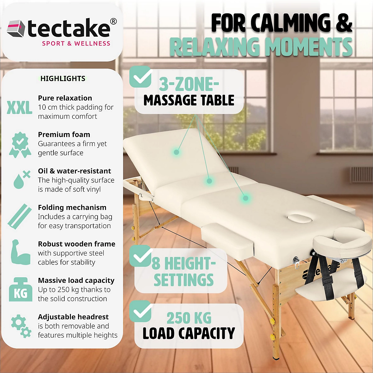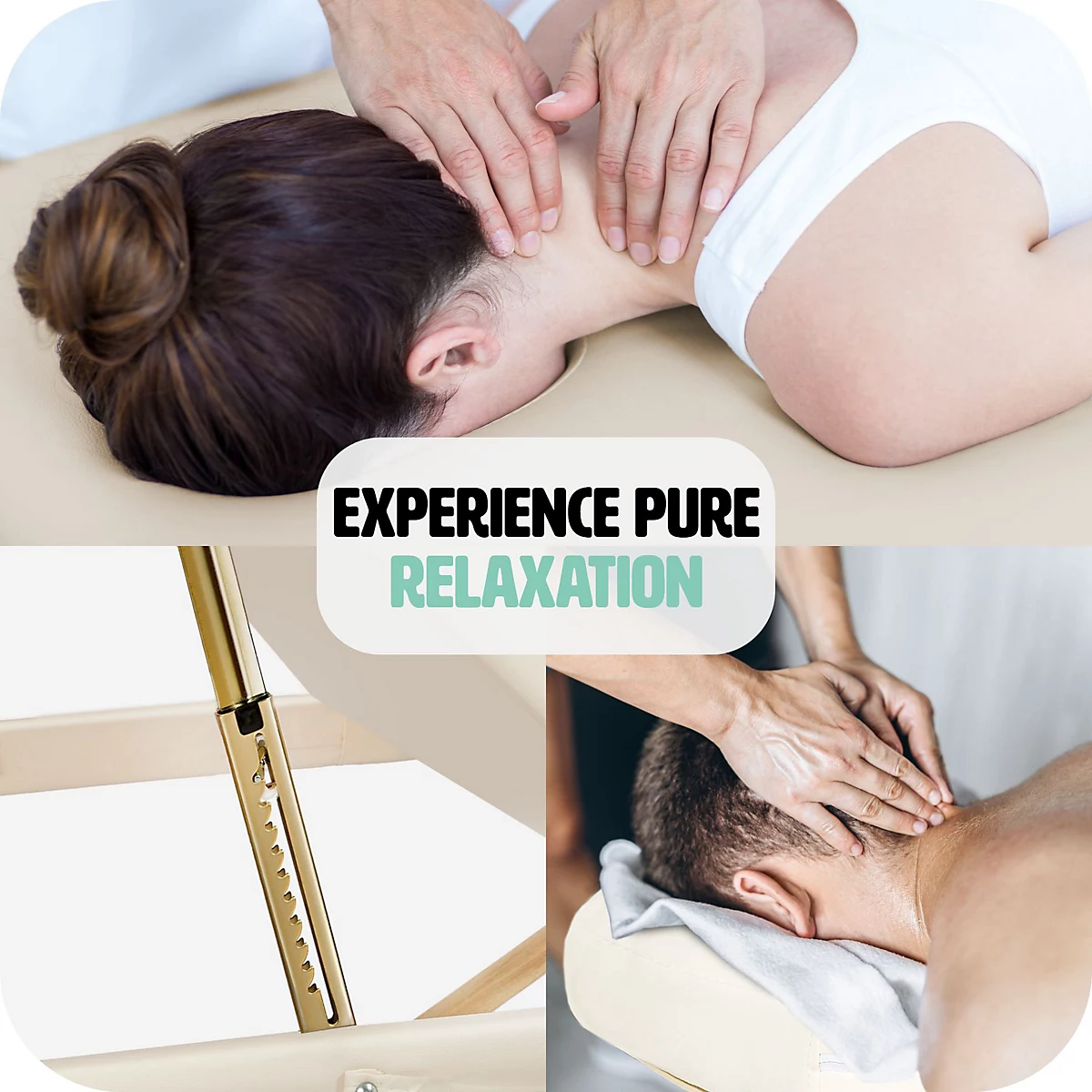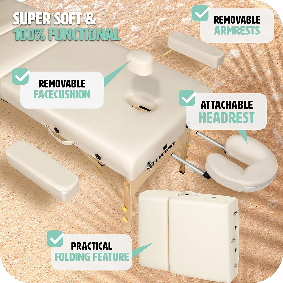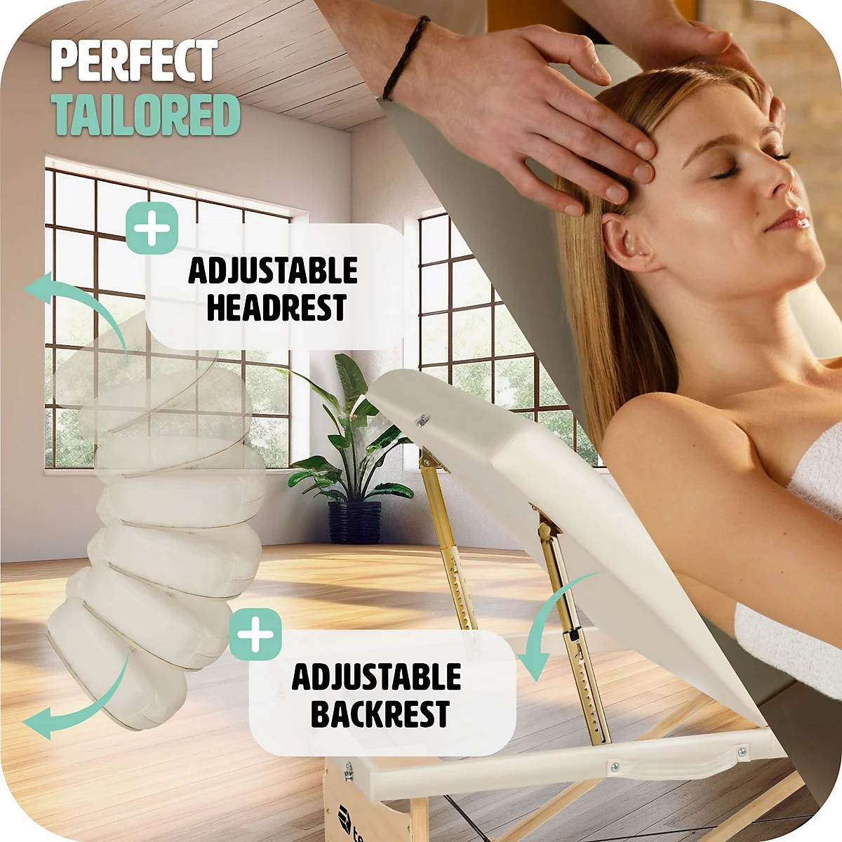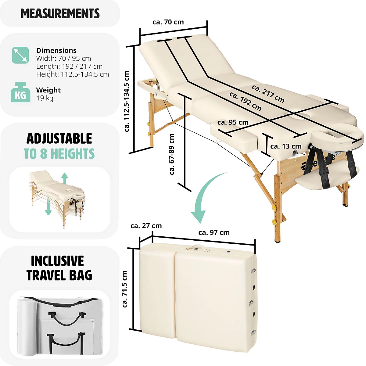 - ملحقات متكاملة: يتضمن مساند للذراعين (تزيد العرض حتى 102 سم)، مسند رأس قابل للفك، وفتحة وجه مدمجة.