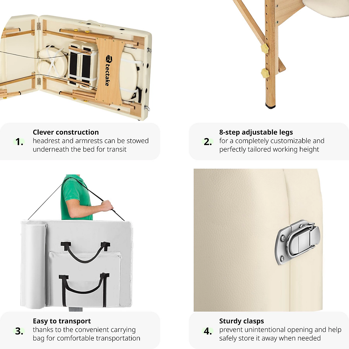 - نظام طي سريع: يمكن تجهيزه أو طيه خلال ثوانٍ معدودة، ويأتي مع حقيبة حمل متينة تجعله الخيار الأول للمعالجين الذين يقدمون خدمات منزلية.