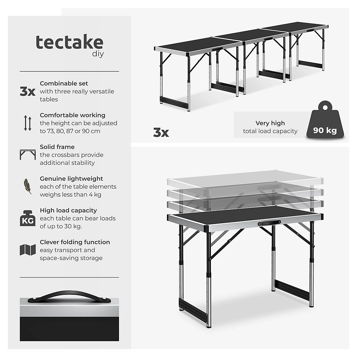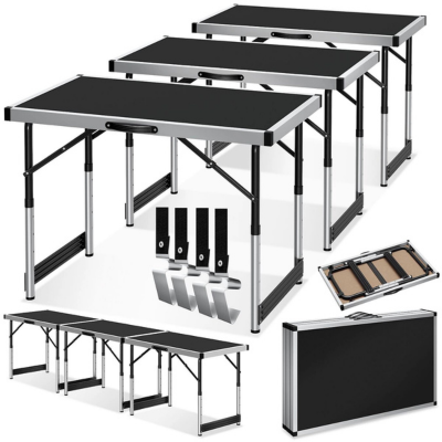 اجعل تحضيراتك للمناسبات، التخييم، أو حفلات الشواء أكثر سهولة مع طاولة Trestle القابلة للطي من tectake. تأتي هذه الطاولة ضمن طقم من 3 طاولات متعددة الاستخدامات يمكن ترتيبها بشكل مرن لتناسب أي مساحة، سواء للاستخدام الداخلي أو الخارجي. بفضل مساحة العمل الكبيرة 300 × 60 سم وإمكانية ضبط الارتفاع في 4 مستويات، يمكن استخدامها لمجموعة متنوعة من الأنشطة، من كطاولة عمل أو طاولة تجهيز أو طاولة حفل، وحتى استخدامات التزيين مثل ورق الحائط.