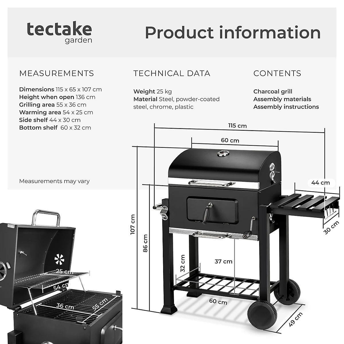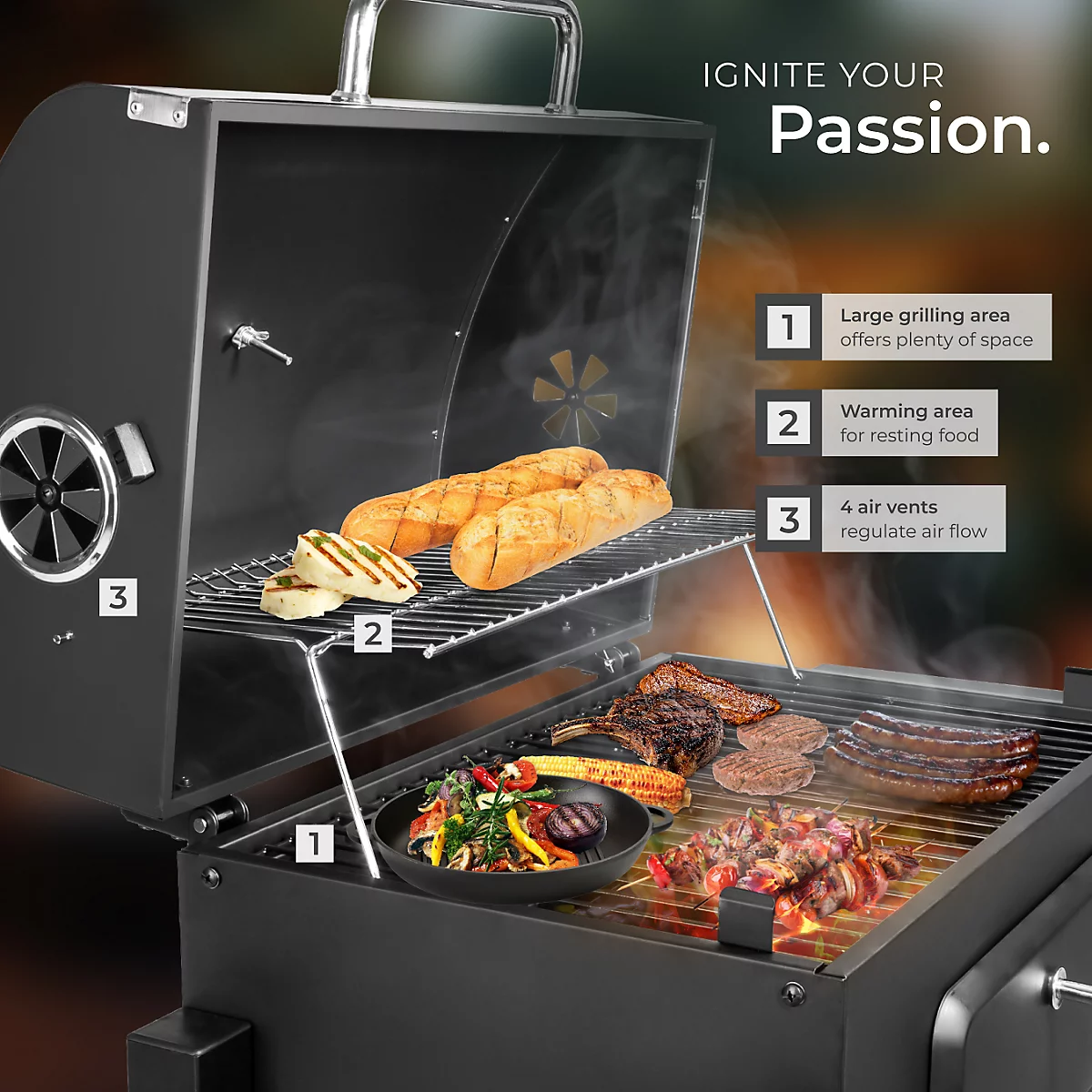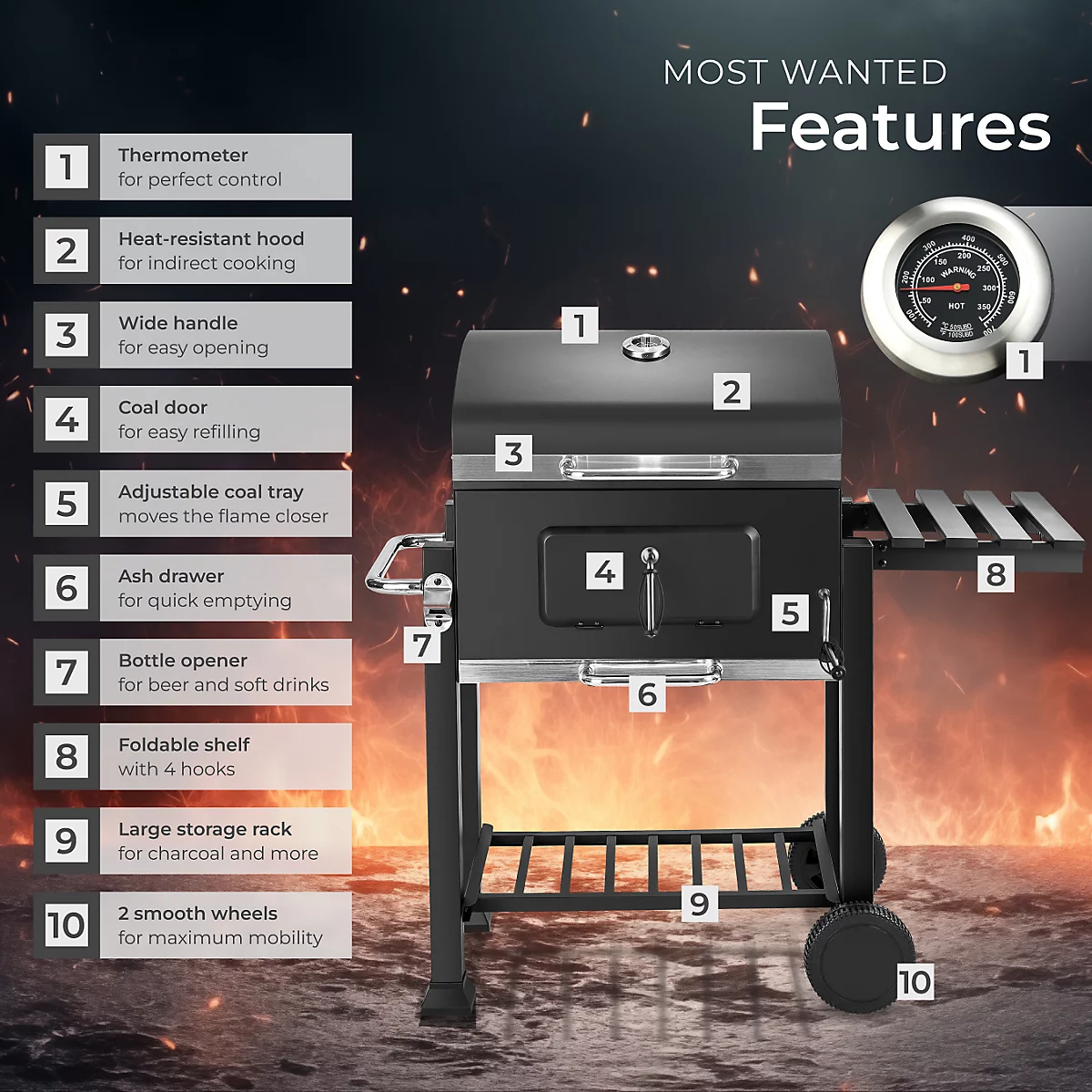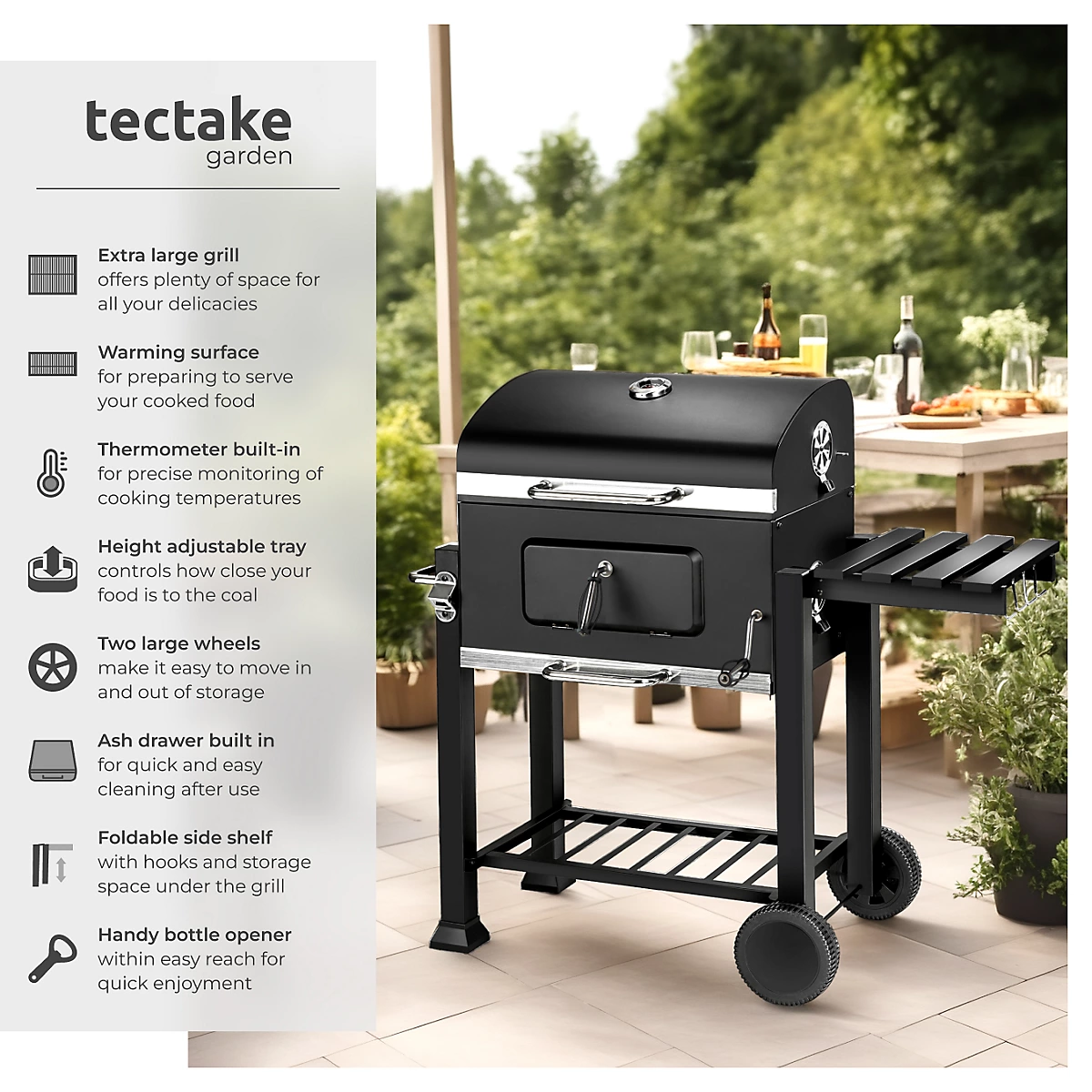 مزودة بعجلات للتنقل بسهولة، درج فحم قابل لتعديل الارتفاع للتحكم بدرجة الحرارة، رف جانبي قابل للطي مع خطاطيف، ترمومتر مدمج، وفتاحة زجاجات مدمجة. مساحة شواٍ كبيرة، سهلة التنظيف بفضل درج الرماد، لتجربة شواء مثالية في الهواء الطلق.