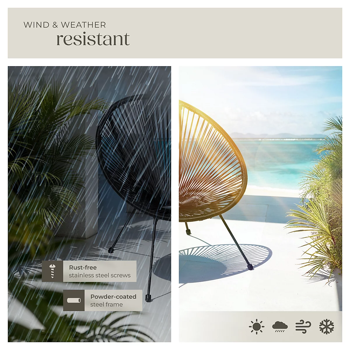 • مقاومة للعوامل الجوية: مواد التصنيع عالية الجودة تضمن بقاء الكراسي بمظهرها الجذاب ومقاومتها للشمس والأمطار لسنوات طويلة