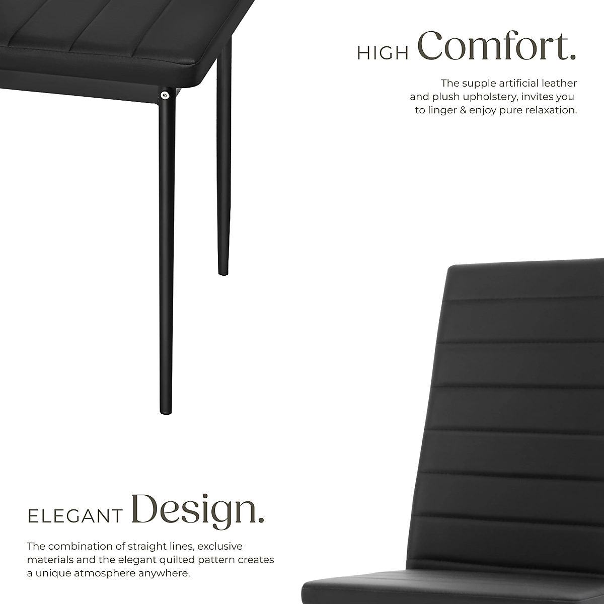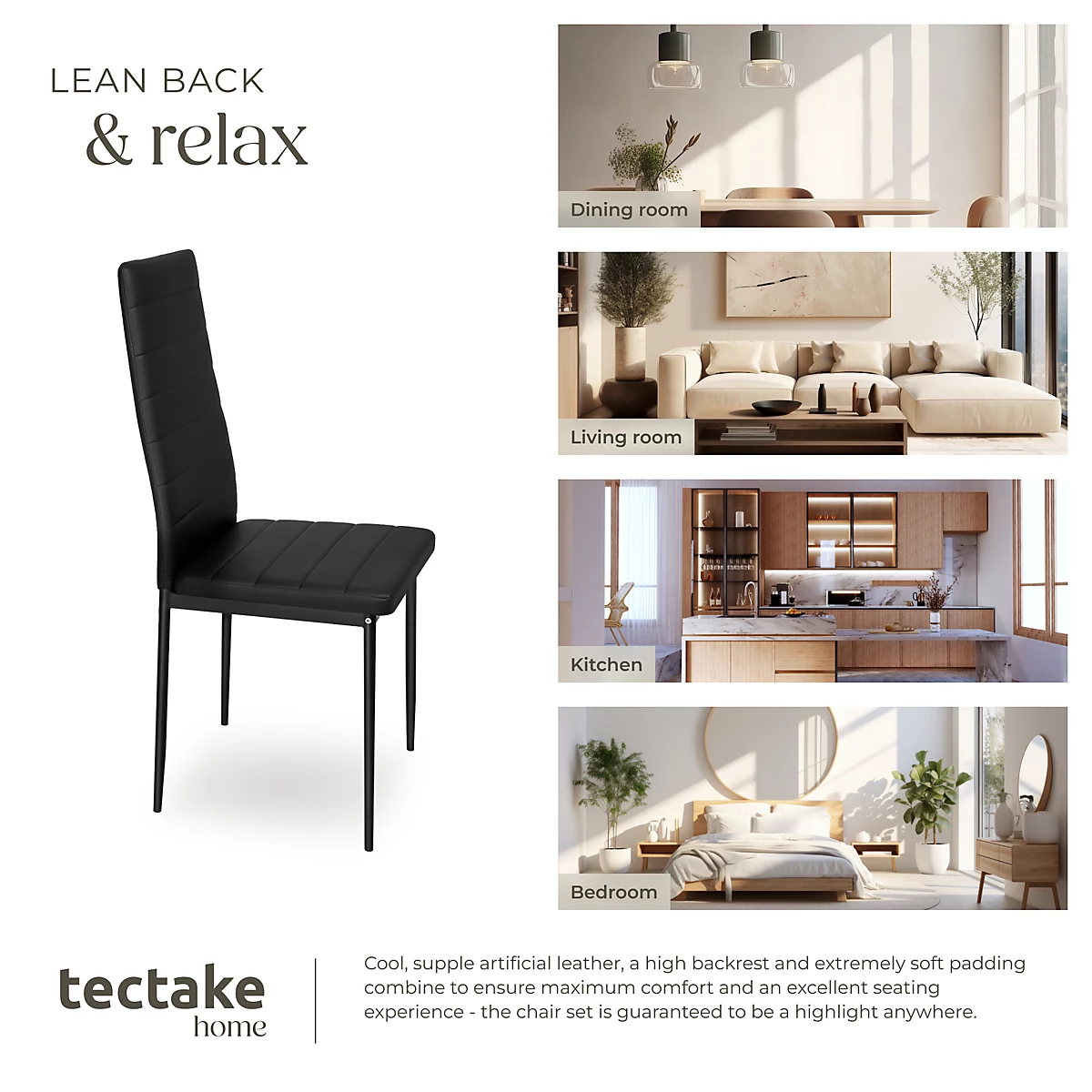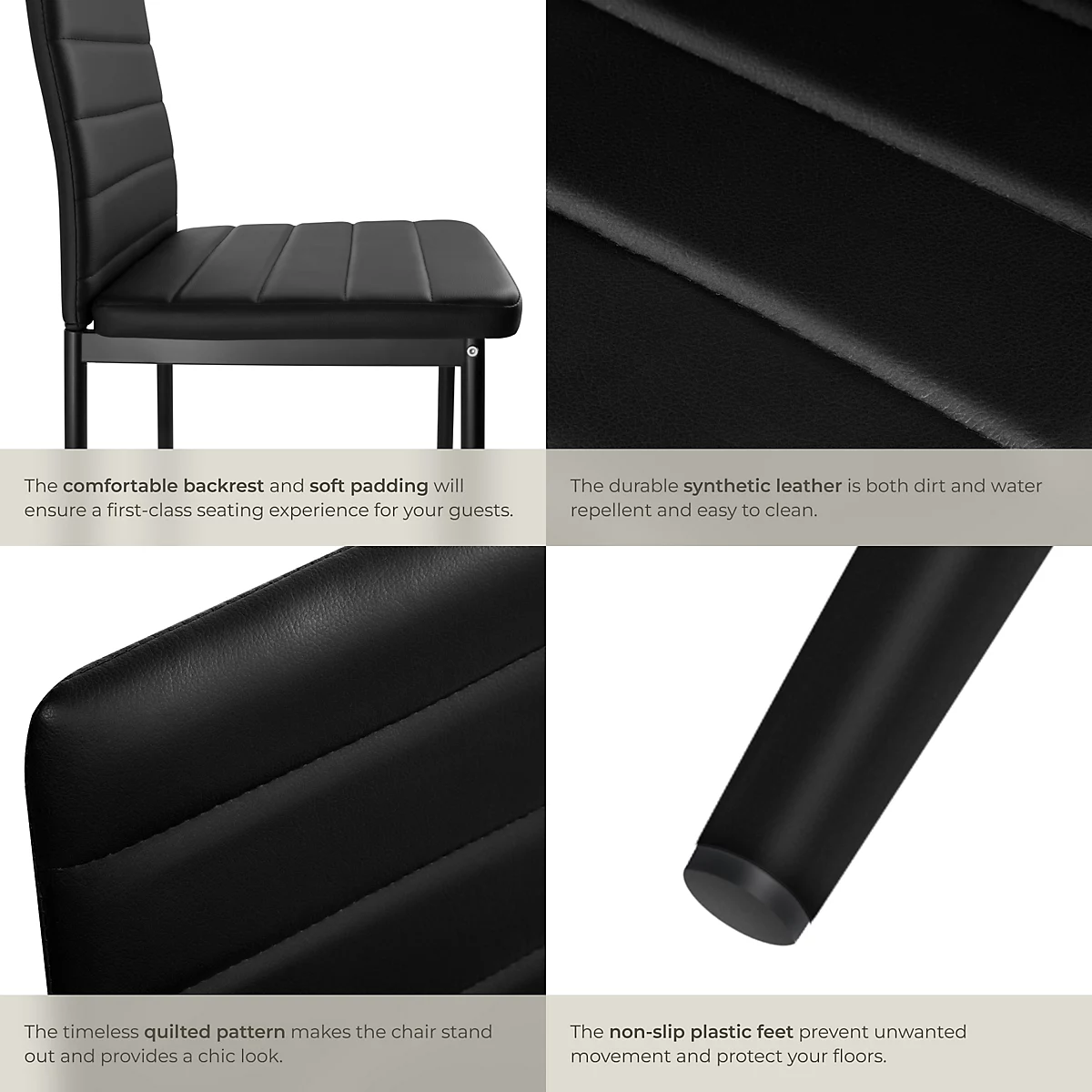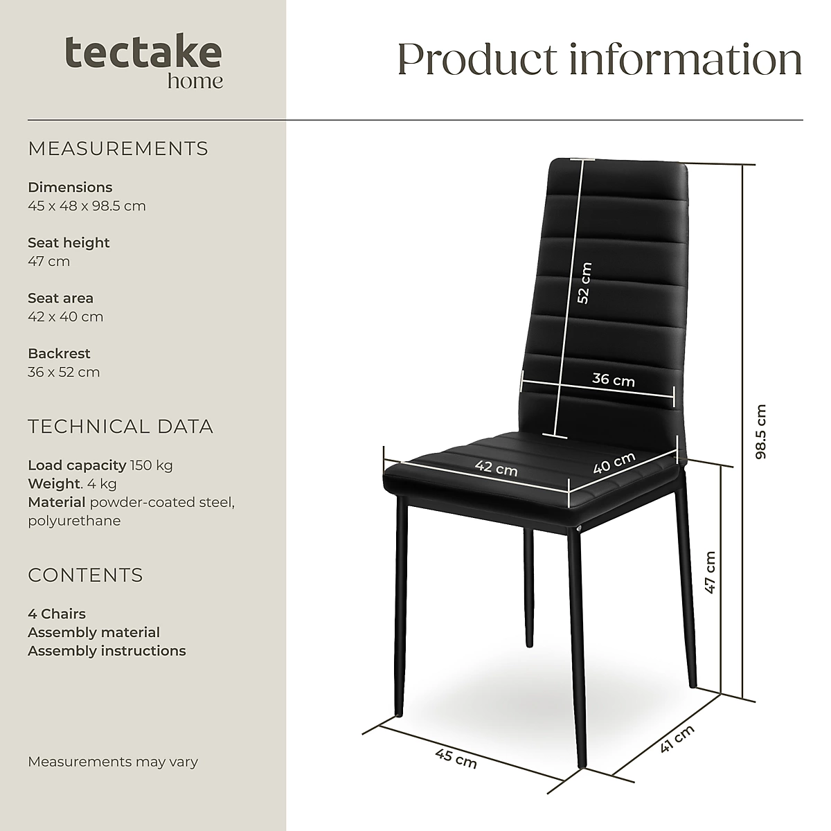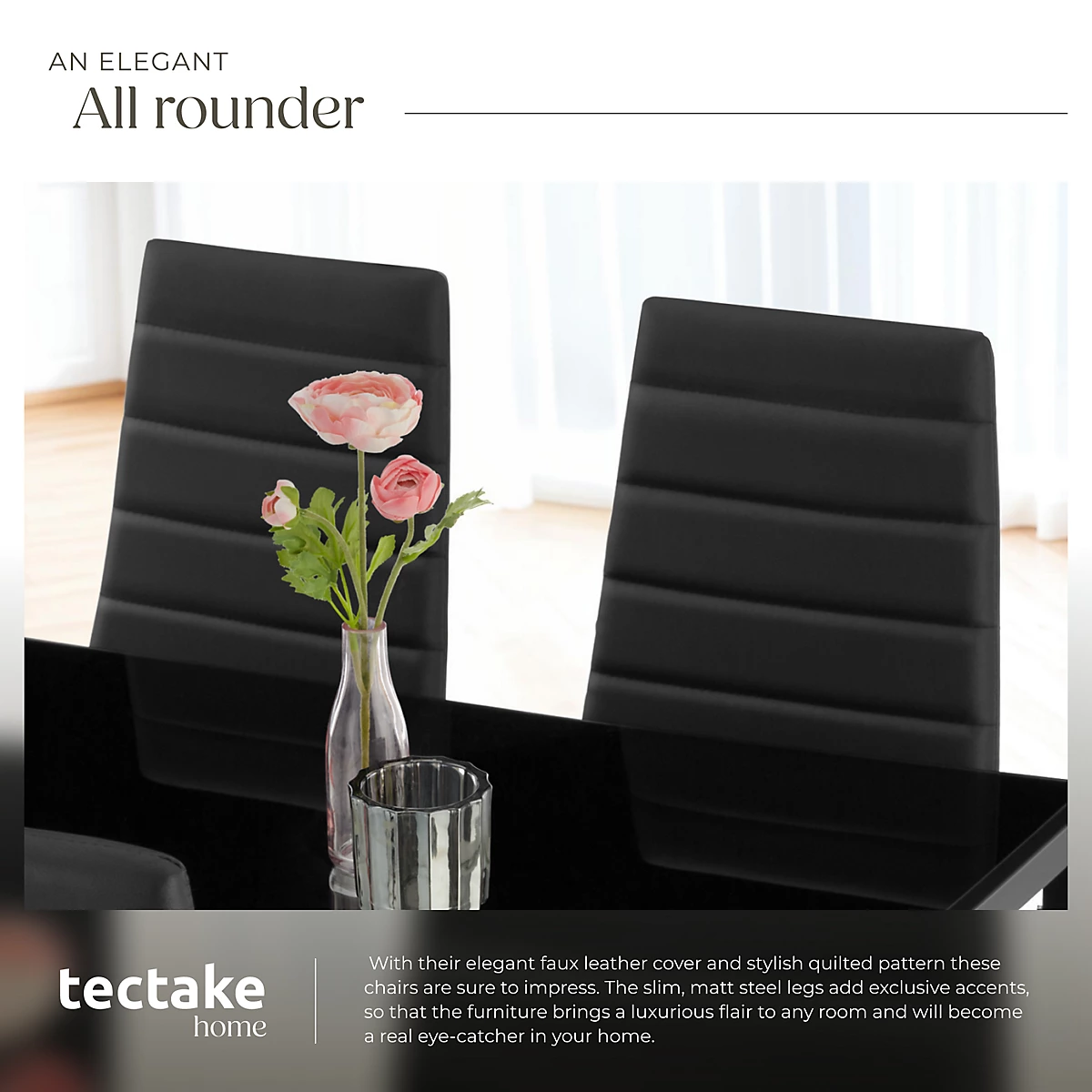 أضف لمسة من الأناقة والراحة لغرفة الطعام أو المطبخ مع طقم 4 كراسي طعام من تكتاكي. تتميز هذه الكراسي بمسند ظهر عالي وتصميم مبطن يغطي المقعد بالكامل، مع غطاء من الجلد الصناعي الأسود سهل التنظيف ويمنح إحساسًا فخمًا وعصريًا.