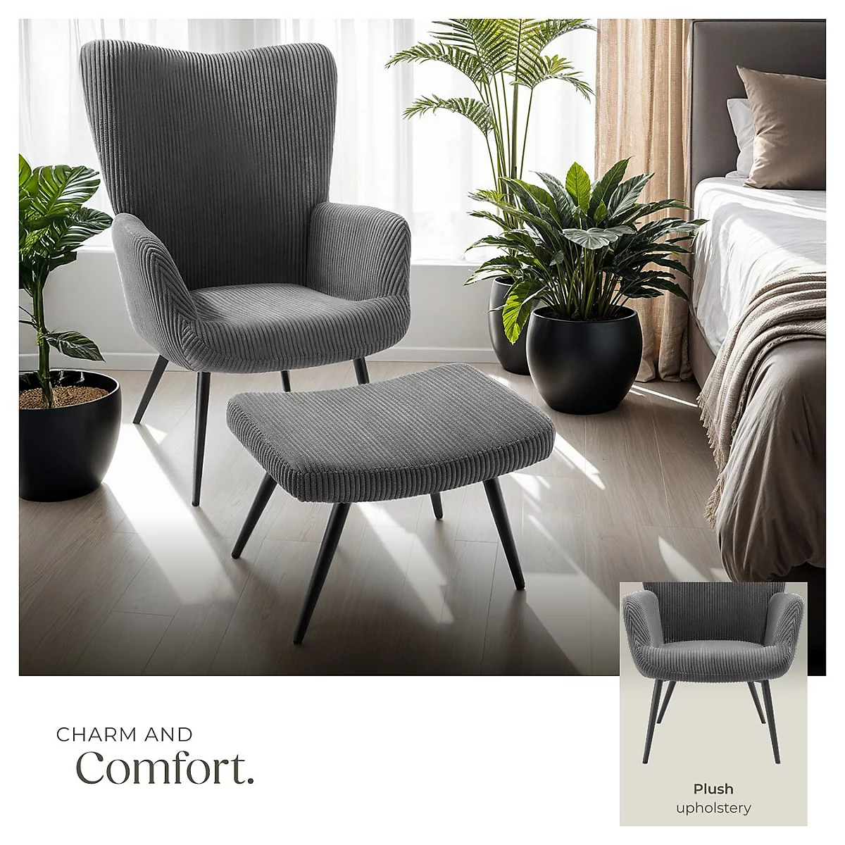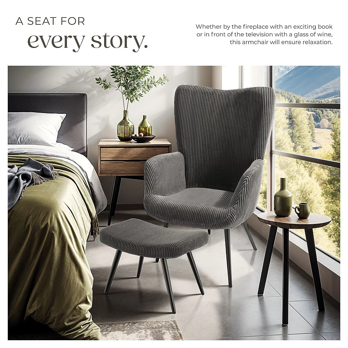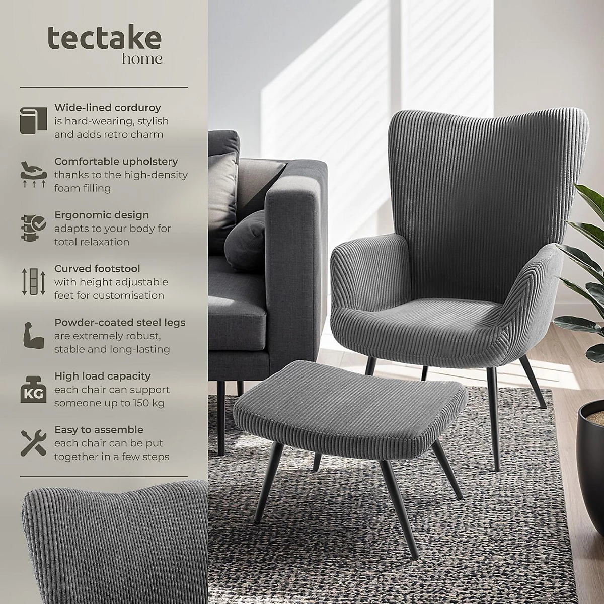 أدخل أجواء الدفء الاسكندنافي إلى منزلك مع كرسي هيغه المبطن مع مسند قدم بقماش كوردروي عريض بلون أنثراسيت وأرجل سوداء. تصميم يجمع بين الراحة العميقة والأناقة العصرية ليكون ركنك المثالي للاسترخاء.