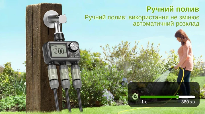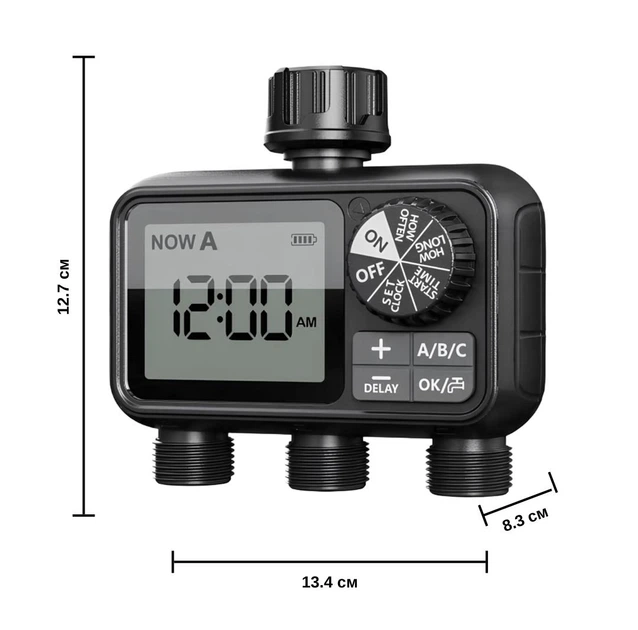 تم تصميم المؤقت للاستخدام الخارجي، حيث يتمتع بحماية IPX5 ضد الماء، ويعمل بكفاءة ضمن ضغط ماء من 0.05 إلى 0.8 ميغاباسكال ودرجات حرارة من +3 إلى +45 درجة مئوية. يعمل ببطاريتين AAA، ما يجعله جهازًا مستقلًا وسهل الاستخدام دون الحاجة للكهرباء، مع شاشة رقمية واضحة تُظهر حالة التشغيل والري لكل منطقة.