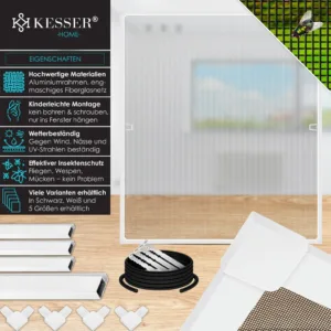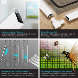 The kit can be mounted on almost all standard windows and offers reliable protection against mosquitoes , flies and other insects . Using a patented fastening system , you can clamp the fly screen to the existing window frame without damaging it , as no drilling or screwing is required. The fly screen frame is easy to assemble, even for non – craftspeople ; the corner connectors are inserted into the aluminum profiles , providing additional stability . It is also suitable for installation between windows and roller shutters . The fly screen with aluminum frame is the ideal solution for rented properties , apartments and houses that are looking for reliable and attractive insect protection . The use of high-quality materials , such as robust and durable aluminum , makes the insect screen particularly weather-resistant and long-lasting .