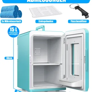 LARGE FILLING VOLUME: The electric cool box comes with an additional car charger and is perfectly designed for use in the car, so that you can always enjoy cold drinks during the journey. Our mini fridge is a 15-litre model, with a second level that can be added if required thanks to the removable shelves. This makes it easy to separate care products from drinks and food.