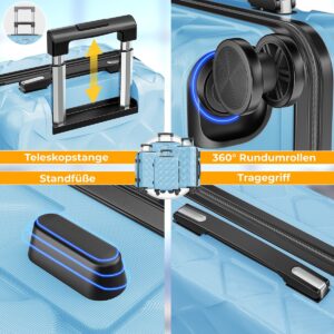 360° SWIVEL WHEELS & ERGONOMIC HANDLING: Thanks to the four high-quality double wheels, the suitcases can be moved effortlessly in all directions. The 360° swivel function ensures maximum maneuverability on any surface. The height-adjustable telescopic pull rod and the side and top handles provide maximum comfort during transport.