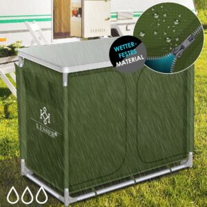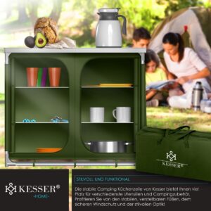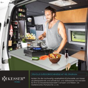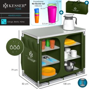 The camping kitchen from KESSER has a lot to offer in a small space. The special thing about the foldable kitchen are the worktops with practical wind screens. The foldable outdoor kitchen can be set up in just a few minutes. The robust aluminium frame and the height-adjustable legs of the kitchen box ensure high stability. When dismantled, the lightweight outdoor kitchen can be easily transported in the supplied carrying bag. With the carrying bag and the small packing dimensions, the lightweight camping kitchen is the perfect travel companion.