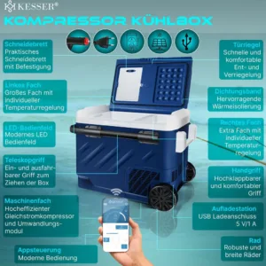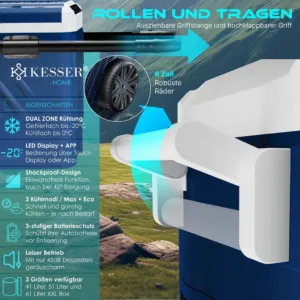 KESSER compressor cool box with DUAL-ZONE cooling and APP control, shockproof design and LED display, 2 cooling modes / Max + Eco, 3-stage battery protection, quiet operation at 45dB, available in three different sizes, USB charging station 5V/1A