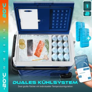 In summary , the cooler bag is a high-quality and reliable cooler that gives you the freedom to enjoy fresh food and drinks on the go. With its dual zone cooling , LED display , shockproof design , various cooling modes and the ability to connect it to a power source or solar or power stations , the compressor cooler is the perfect solution for those who value quality and convenience. In addition to the high performance and versatility of the compressor cooler, the product also offers the option of control via a mobile app . This feature allows users to conveniently control the cooler from their smartphone and adjust various settings . From temperature control to checking the operating status , users can easily and intuitively manage the cooler via the app .