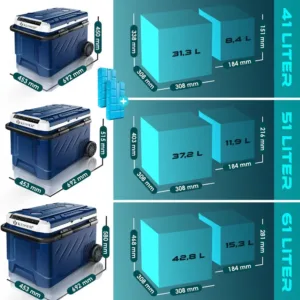 Despite its power and capacity, the compressor cooler operates particularly quietly , making it unobtrusive in quiet surroundings. You can choose between three different sizes: 41 liters, 51 liters, and the 61-liter XXL cooler . The car cooler features a dual AC/DC plug , allowing it to be used in both power outlets and in the car .