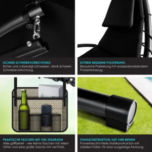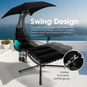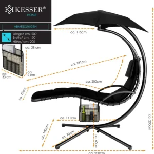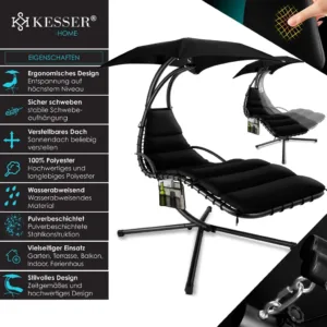 The comfortable hanging lounger conveys a holiday feeling and invites you to sunbathe . Read a book while gently swinging , relax , rest or simply let the day come to an end ? The KESSER relaxation lounger will help you do this . Thanks to its beautiful and modern design, this chic floating lounger is an absolute highlight in your garden , on the terrace or on the balcony and serves as the perfect place to relax .