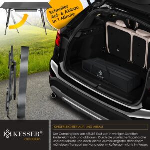 Easy to use: Our premium camping table is the perfect companion for any camping trip or outdoor activity. The table is made of lightweight aluminum, which not only makes it particularly robust and durable, but also easy to transport. Weighing only 5.9 kg, it can be easily carried by one person.
