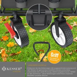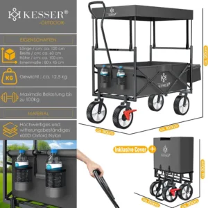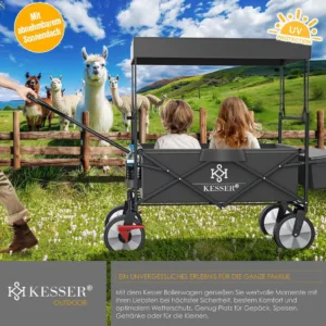 The KESSER handcart is a true all-rounder among foldable transport carts . With its loading area , additional XXL bag at the rear and various holders, it offers plenty of space for trips with the kids, festivals or other leisure activities , and can also be folded up compactly when required . The removable roof also offers reliable protection from the sun and rain showers . This is where functionality meets sophisticated design . This large handcart with a roof offers space and, thanks to the thick frame padding , plenty of comfort for small passengers . You too can be impressed! It has a front wheel brake . Two additional drinks pockets at the front and an XXL pocket with a zipper at the rear offer storage space for drinks and small items . The large handcart can be folded up in just a few easy steps and stowed away to save space . Look forward to long trips with this foldable handcart ! Because with this foldable transport cart you can also take a little more luggage !