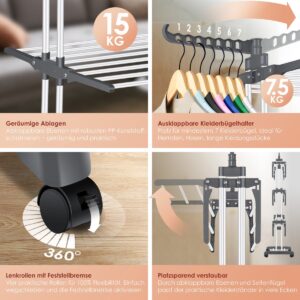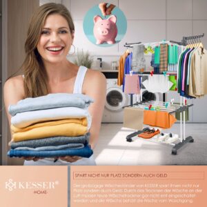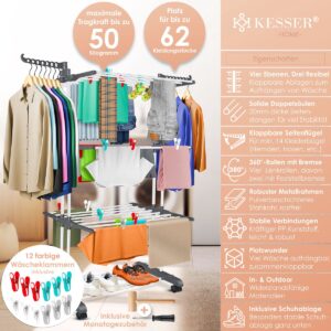 PRACTICAL AND SPACE-SAVING: The KESSER drying rack offers you generous space for drying up to 62 items of clothing and an impressive load capacity of 50 kilos. With fold-out side wings and space for 14 hangers, it maximizes your washing capacity while remaining space-saving and easy to fold.