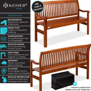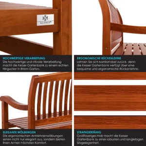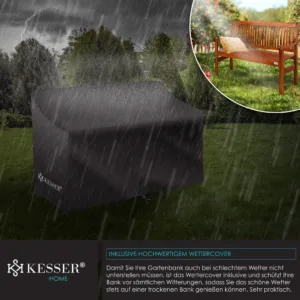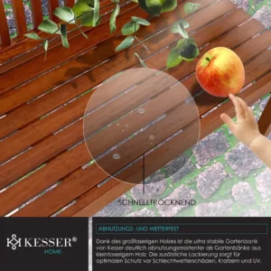 The high-quality and stylish garden bench from the KESSER brand combines two advantages . Firstly, the bench is a visually modern highlight that gives your garden that certain something. Secondly, the park bench serves as a practical place to sit and transform your garden into a relaxing nature park . Lean back , enjoy the end of the day and listen to the birds chirping . Enjoy precious moments on the stylish garden bench from KESSER . Made from hard-wearing , robust and varnished wood , you benefit from the exceptionally high quality , durability and optimal comfort . Thanks to the large-grain wood, the ultra-stable garden bench from KESSER is significantly more wear-resistant than conventional garden benches . The additional varnish provides optimal protection against bad weather damage , scratches and UV rays . Curved shapes and ergonomic curves not only ensure ideal comfort , but also make the high-quality and robust garden bench a real feast for the eyes in your garden , in front of the house, indoors or in your conservatory . Here you will find enough space for several people to enjoy the weather with coffee and cake . But even alone you can create beautiful