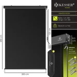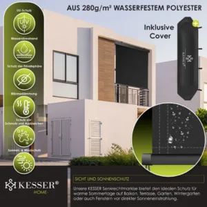 Discreet , elegant , and effective sun protection – if it’s too hot outside in the summer, you’ll appreciate the cooling effect in the rooms behind it. The sun protection can be installed not only on balconies and terraces, but also in gardens, conservatories, or on windows to counteract direct sunlight. The vertical awning not only protects against the sun but can also serve as a privacy screen from neighbors. It can also be used as glare and weather protection.