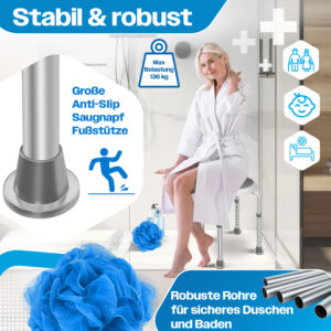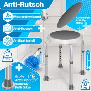 The KESSER shower stool is the ideal solution for safe, comfortable, and flexible showering and bathing. Thanks to its water-repellent and antibacterial properties, it is ideal for use in humid environments such as the bathroom. The removable anti-slip mat and the large anti-slip suction cup footrest offer maximum stability, even on wet surfaces. With a seat diameter of 29.5 cm and a height-adjustable function in 8 levels from 36 cm to 51 cm, the stool can be perfectly adapted to individual needs.