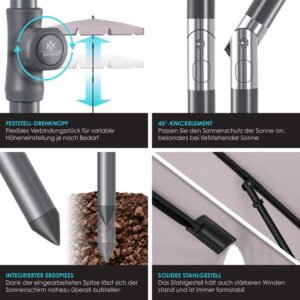 FLEXIBLE ADJUSTMENT OPTIONS: The portable garden parasol can be adjusted on both sides with the folding joints at an angle of 45°. Simply press the button on the joint and adjust the angle. This allows the parasol to be individually adjusted to the position of the sun. The height can also be easily adjusted with the lockable rotary knob, ranging from 160 cm to 240 cm, depending on your needs.