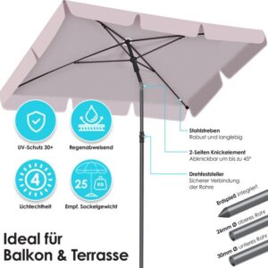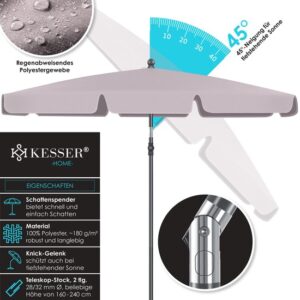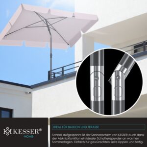 SAFE AND ROBUST: The sturdy telescopic pole, consisting of two parts of lightweight, rust-proof aluminum with a diameter of 28/32 mm, is easy to assemble for stable support. In addition, the parasol can be attached to your balcony railing with the matching KESSER parasol holder to withstand wind and weather. The canopy cloth is made of 100% polyester with a density of 180 g/m2 and is water-repellent, so you can also use the parasol in rainy weather.