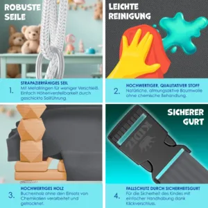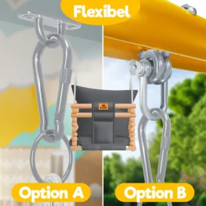 The outstanding feature of this swing is its robust rope construction . Thanks to the clever rope guide, height adjustment is child’s play, allowing you to effortlessly adapt the swing to your needs. From 190 cm to 260 cm in height, the swing can be flexibly adjusted to suit different rooms or environments.