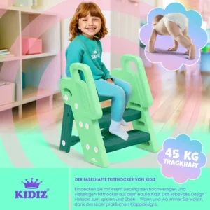 KIDIZ step stool with folding function made of high-quality and sturdy materials for children from 18 months to 6 years, height-adjustable and load-bearing up to 45 kg, safe anti-slip feet including assembly key, flexible use in the bathroom, kitchen, children’s room or for toilet training