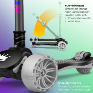 GROW WITH: A city scooter for all ages and different body sizes – thanks to the flexible height adjustment, the scooter grows with the size of your child and is – between 65-80cm – adjustable in height in three steps. The fun sports scooter intuitively steers on gravity by shifting weight. Cracks in the handlebars are prevented and at the same time your child’s sense of balance is trained.