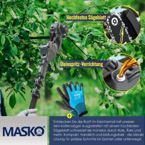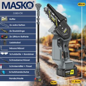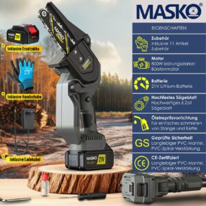 The MASKO mini chainsaw with an output of 800W and two 4000mAh batteries is a powerful tool specially designed for efficient and comfortable cutting. With a compact size of 8 and 6 inches and a low weight, it is easy to handle and ideal for a variety of tasks in the garden, yard or forest.